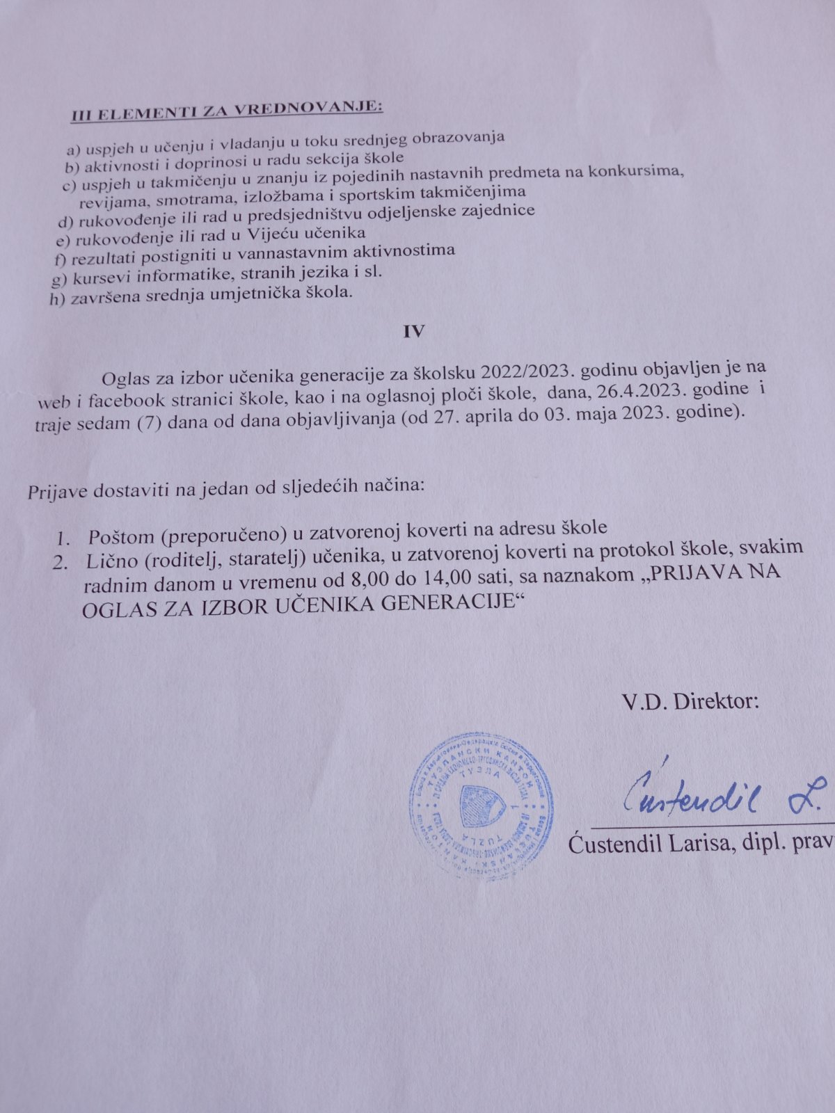 JU Ekonomsko-trgovinska škola je 26.4. 2023. god. raspisala konkurs za izbor učenika genercije za školsku 2022./2023. godinu. Odluku o raspisivanju konkursa, konkurs i  kriterijume konkursa možete vidjeti u prilogu. Učenici potrebnu dokumentaciju trebaju predati u školu, najkasnije do 5.5.2023. godine.